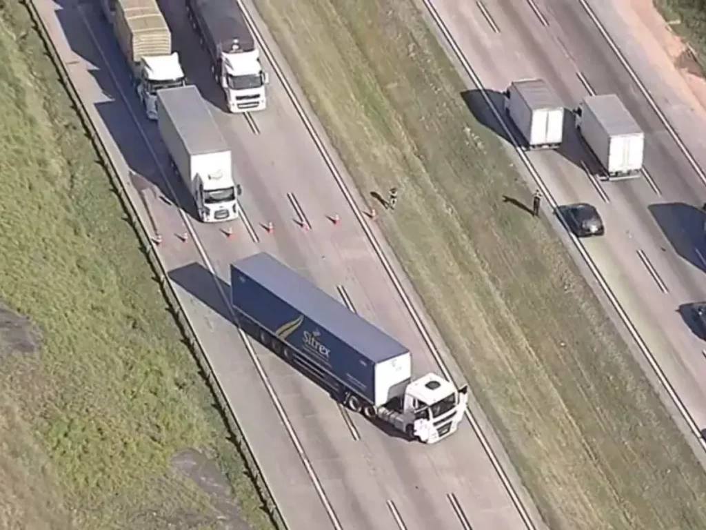 Segundo relato da concessionária que administra o trecho, o condutor informou que foi abordado por três indivíduos por volta das 4h da manhã, sofreu assalto e sequestro, foi obrigado a atravessar o caminhão na pista e a ficar amarrado com supostos explosivos.