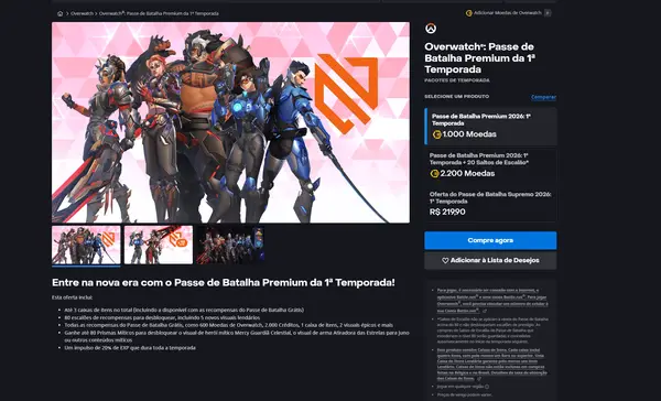 Na loja oficial da Blizzard, a informação é direta: caixas de itens não estão incluídas em compras feitas no Brasil. O passe de batalha continua sendo vendido normalmente (a partir de 1000 moedas, cerca de R$ 46), mas sem oferecer loot boxes pagas como recompensa.