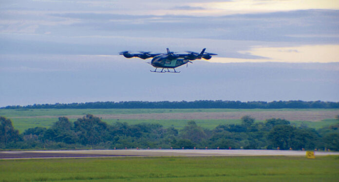 O teste aconteceu no complexo da empresa em Gavião Peixoto, no interior de São Paulo. Durante cerca de um minuto, o protótipo fez um voo pairado — quando a aeronave permanece parada no ar — operando remotamente e sem piloto a bordo.