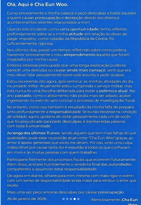 O cantor e ator Cha Eun-woo se pronunciou publicamente nesta segunda-feira (26) sobre as acusações de sonegação fiscal que vêm repercutindo na Coreia do Sul. Em uma carta aberta divulgada nas redes sociais, o artista pediu desculpas aos fãs e afirmou que assume a responsabilidade pelo ocorrido.