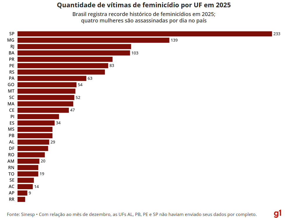 O Brasil registrou, em 2025, o maior número de feminicídios desde que o crime passou a ser tipificado em lei. Foram 1.470 casos ao longo do ano, segundo dados do Ministério da Justiça e Segurança Pública — um novo recorde, mesmo antes da consolidação completa dos números de dezembro em alguns estados.