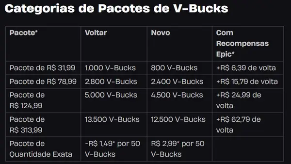 Com a atualização, os pacotes vendidos passarão a oferecer menos V-Bucks do que antes. Um exemplo citado pela empresa é o pacote que incluía 1.000 V-Bucks, que passará a oferecer 800 V-Bucks.