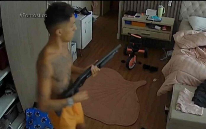 Câmeras de segurança mostraram o influenciador Bruno Alexssander Souza Silva, conhecido nas redes sociais como Buzeira, pegando uma espingarda no momento em que a Polícia Federal chegou à sua casa, em Igaratá (SP), para cumprir um mandado de prisão.