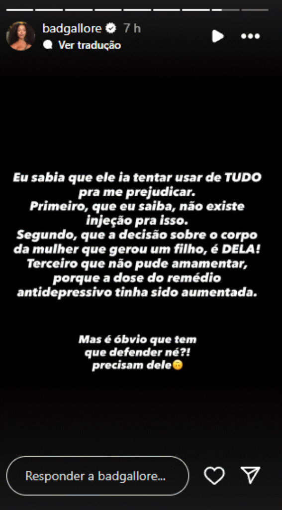 “Não existe essa injeção. Eu não amamentei porque estava tomando antidepressivos com dose alta. A decisão sobre o corpo da mulher é dela!”, respondeu.