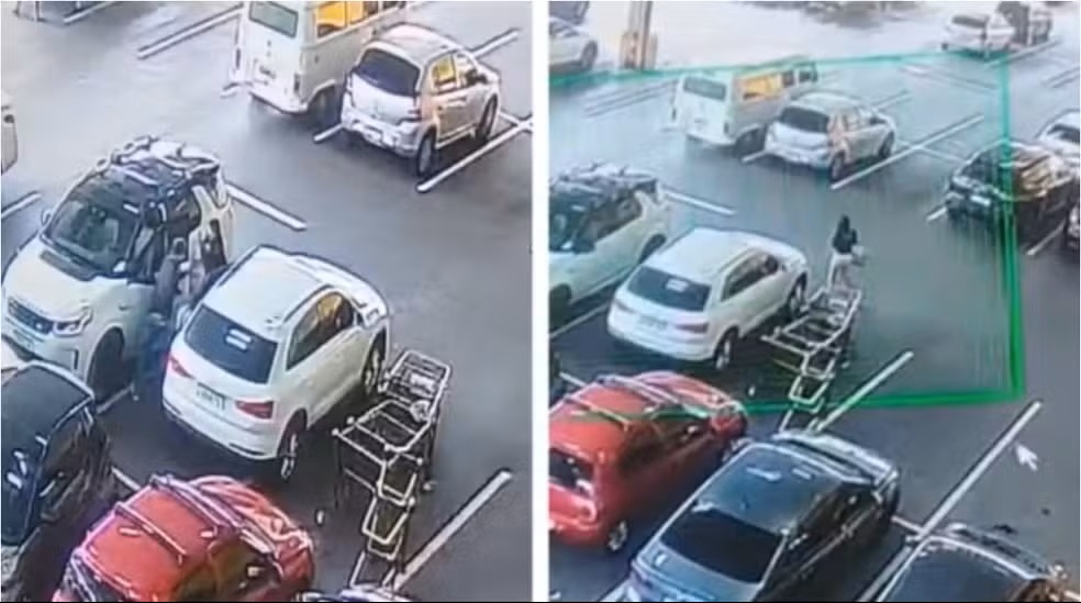 Câmeras de segurança registraram a ação. Nas imagens, a vítima aparece se aproximando do próprio carro com sacolas de compras quando um dos suspeitos abre a porta de um veículo ao lado, aponta uma arma e a obriga a entrar. Dentro do carro estavam outros dois comparsas.