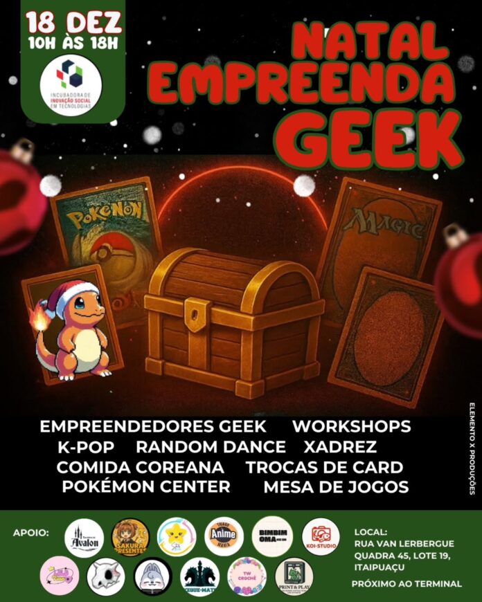 No dia 18 de dezembro, das 10h às 18h, Itaipuaçu vai virar o point oficial da galera nerd, gamer, otaku, criativa e colecionadora. É o Natal Empreenda Geek, um evento feito pra quem vive entre mundos, fandoms, decks e dancinhas de K-pop!