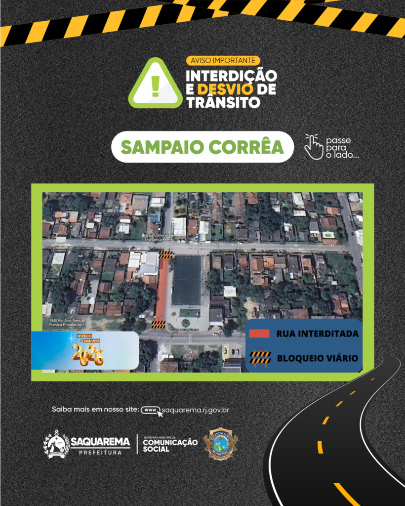 - Saquarema: a Avenida Ministro Salgado Filho será interditada, com desvio pela Rua Oito de Maio. A Rua Dr. Luiz Januário terá bloqueio parcial, entre o antigo Supermercado Batista e a Praça do Artesanato.