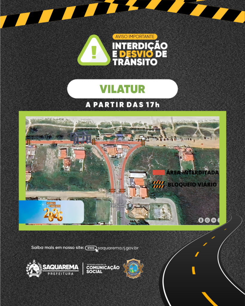 - Vilatur: bloqueios na Avenida Beira Mar, próximo ao posto de saúde. Durante o dia, a Avenida Nova Saquarema segue liberada.