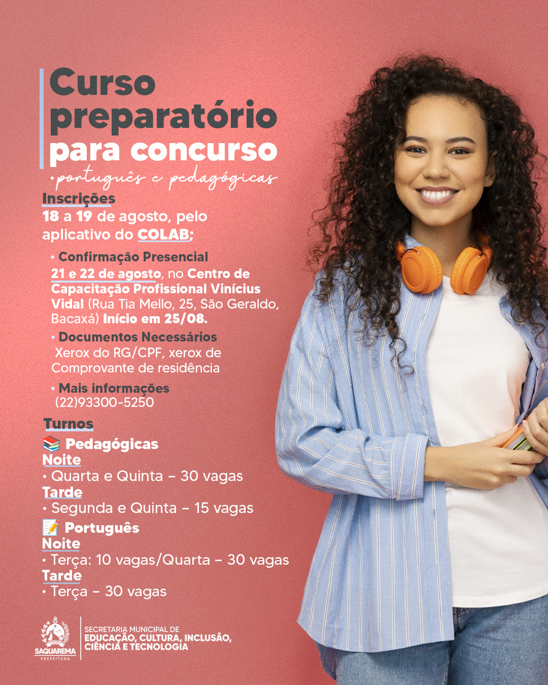 A Prefeitura de Saquarema, por meio da Secretaria Municipal de Educação, Cultura, Inclusão, Ciência e Tecnologia, está oferecendo aulas gratuitas de Português e Pedagógicas para quem quer se preparar para concursos e processos seletivos.