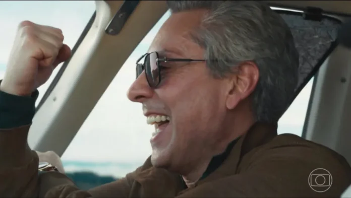 Na nova releitura escrita por Manuela Dias, o empresário — acusado de desvio e lavagem de dinheiro enquanto presidia a TCA — tenta fugir da polícia ao lado da esposa, Leila (Carolina Dieckmann). Durante a fuga cinematográfica, cheia de tiros e perseguição, o vilão comemora a “escapada” fazendo o gesto icônico dentro do jato particular.